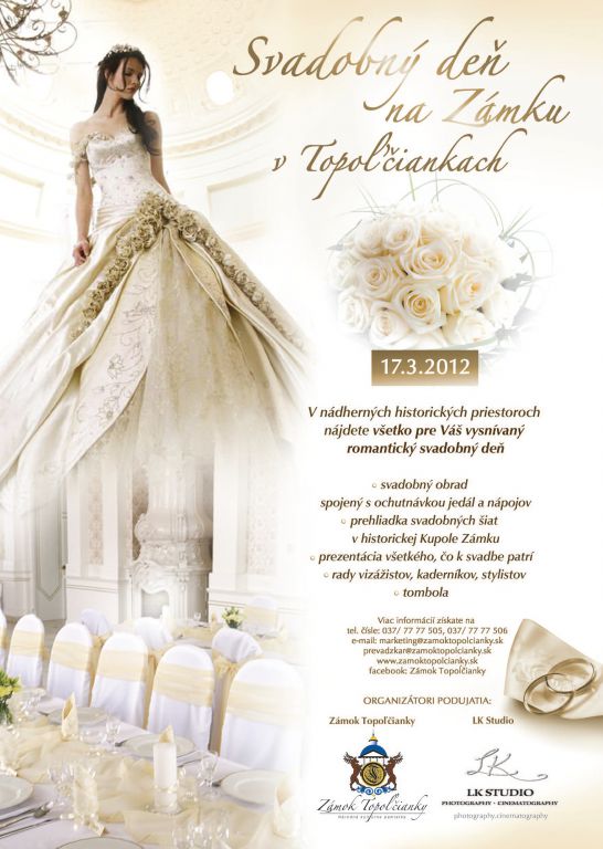 V nádherných historických priestoroch nájdete všetko pre Váš vysnívaný romantický svadobný deň. Svadobný obrad spojený s ochutnávkou jedál a nápojov prehliadka svadobných šiat prezentácia všetkého, čo k svadbe patrí rady vizážistov, kaderníkov, stylistov, tombola.