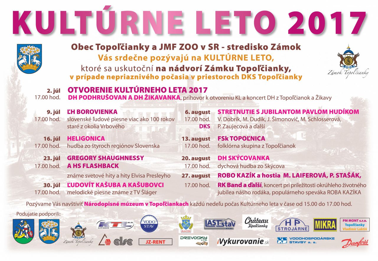 V letných mesiacoch júl a august v roku 2017 naďalej pokračujeme v realizácii podujatia „Kultúrne leto“ a snažíme sa zachovať jeho dosiahnutú úroveň a návštevnosť. Podujatie bolo obnovené po niekoľkoročnej prestávke v roku 2003 a v roku 2017 sa bude konať už jeho XV. ročník. Kultúrne leto sa bude konať v príjemnom prostredí národnej kultúrnej pamiatky , nádvoria Zámku v Topoľčiankach. V prípade nepriaznivého počasia sa využije náhradná alternatíva priestorov – veľká sála DKS Topoľčianky. Jednotlivé vystúpenia sú pre návštevníkov bezplatné. Program pozostáva z deviatich vystúpení počas nedieľ prázdninových mesiacov, v rámci ktorých vystúpia folklórne súbory, ľudové a dychové hudby, ktoré prezentujú kultúrne dedičstvo a tradície regiónov Slovenska. Program bude obohatený o pestrú ponuku interpretov, ktorí u nás v rámci Kultúrneho leta ešte nevystupovali. Dve podujatia sú venované životným jubileám našich významných rodákov: Pavlovi Hudíkovi, dlhoročnému režisérovi a scenáristovi Slovenského rozhlasu a Robovi Kazíkovi, spevákovi populárnych piesní.