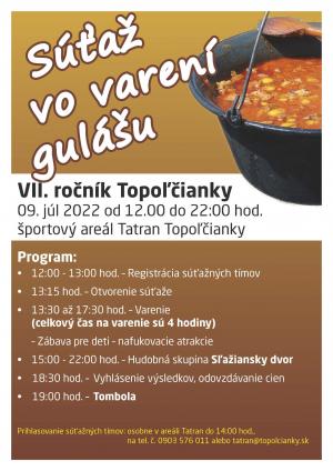 V sobotu 9. 7. 2022 sa bude konať v športovom areáli Tatran Topoľčianky VII. ročník Súťaže vo varení gulášu.