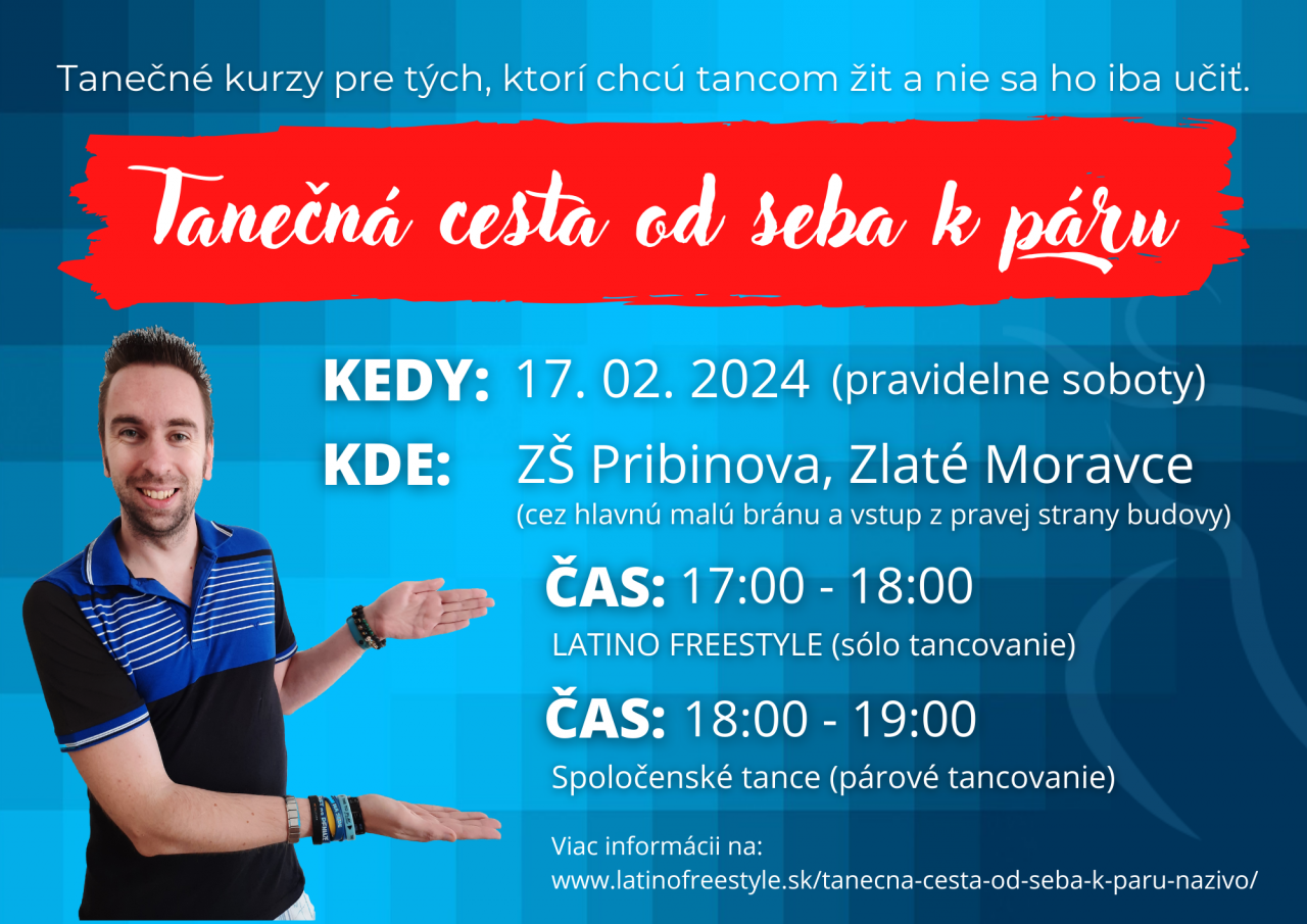 LATINO FREESTYLE (sólo tancovanie) začínajúce od 17:00 a SPOLOČENSKÉ TANCE (párové tancovanie) začínajúce od 18:00, ktoré vieš následne využiť či už na diskotékach, párty, alebo spoločenských akciách (plesy, zábavy, jubileá a pod.).