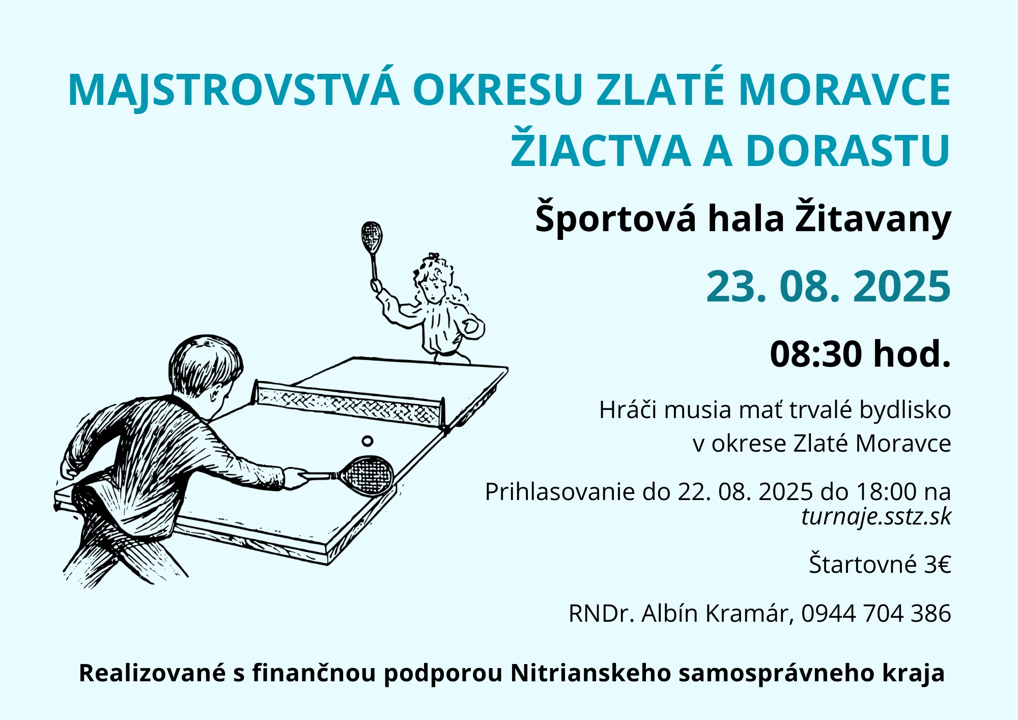 Majstrovstvá okresu Zlaté Moravce sa budú konať 23. augusta 2025 v športovej hale Žitavany. Podujatie je určené pre žiakov a dorast, pričom hráči musia mať trvalé bydlisko v okrese Zlaté Moravce. Prihlasovanie prebieha do 22. augusta 2025 a štartovné je stanovené na 3€.