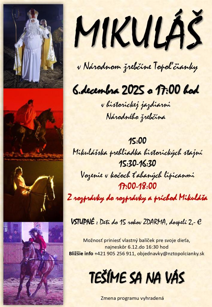 Národný žrebčín Topoľčianky Vás dňa 6.decembra 2025 pozýva na Mikulášske popoludnie do priestorov jazdiarne Národného žrebčína, ktoré budú sprístupnené od 15.00 hod. Vaše deti budú mať možnosť povoziť sa v koči ťahanom lipicanmi, o 17.00 hod. sa začne vystúpenie „Z rozprávky do rozprávky“ a následne spolu privítame Mikuláša s jeho družinou. Deti do 15 rokov majú vstup zdarma, pre dospelých je vstupné 2,- €. Všetci ste srdečne vítaní.
