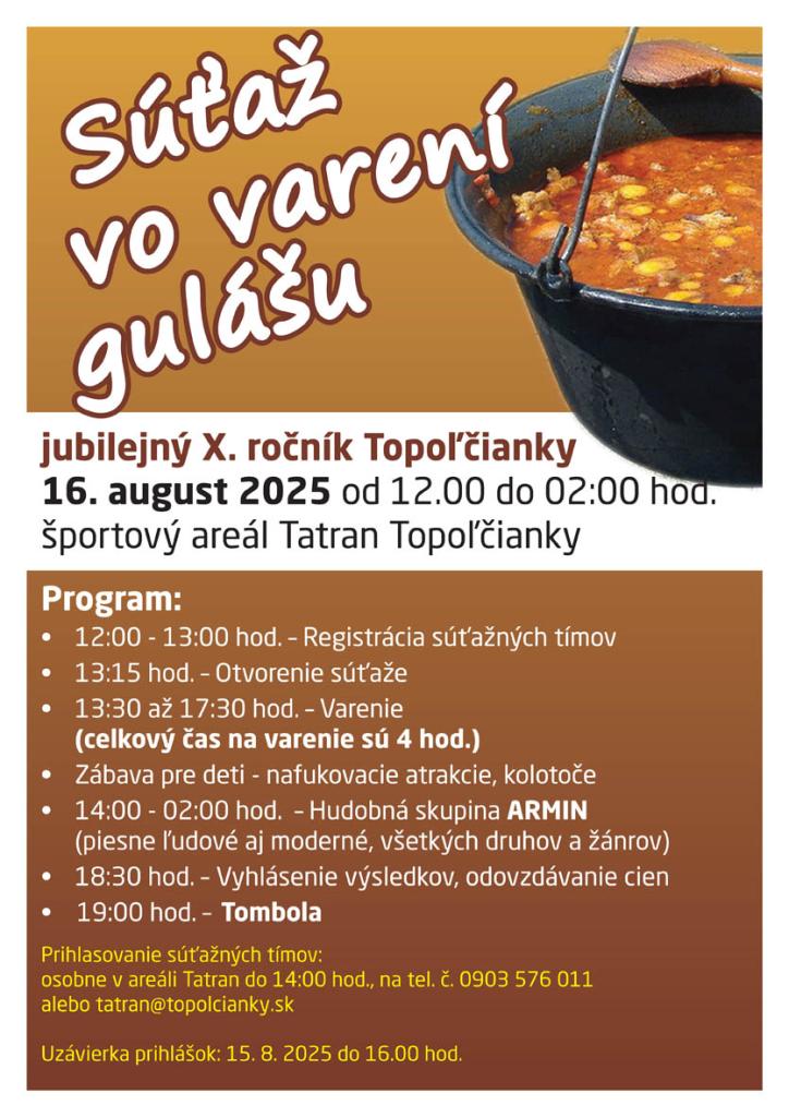 Obec Topoľčianky vás pozýva na jubilejný 10. ročník súťaže vo varení gulášu, ktorý sa uskutoční v sobotu 16. augusta 2025 od 12.00 hod. do 02.00 hod. v športovom areáli Tatran Topoľčianky.