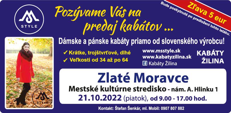 V ponuke majú kabáty krátke, trojštvrťové, dlhé, vo veľkostiach od čísla 34 až po 64. Predaj kabátov sa koná v Zlatých Moravciach v Mestskom kultúrnom stredisku na Námestí A. Hlinku, v piatok 21. októbra 2022 od 9.00 do 17.00 hod.