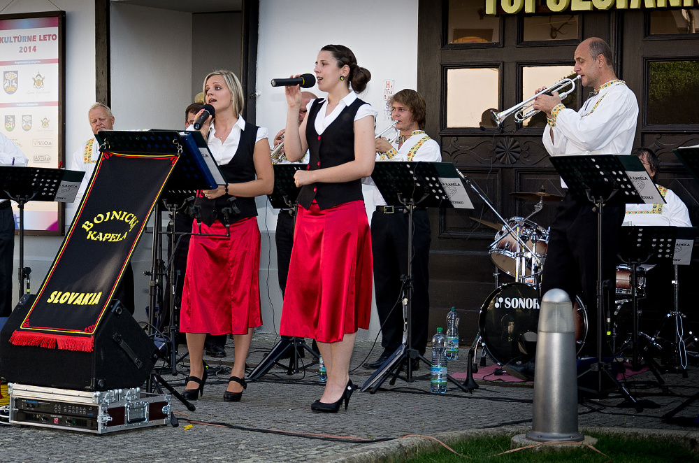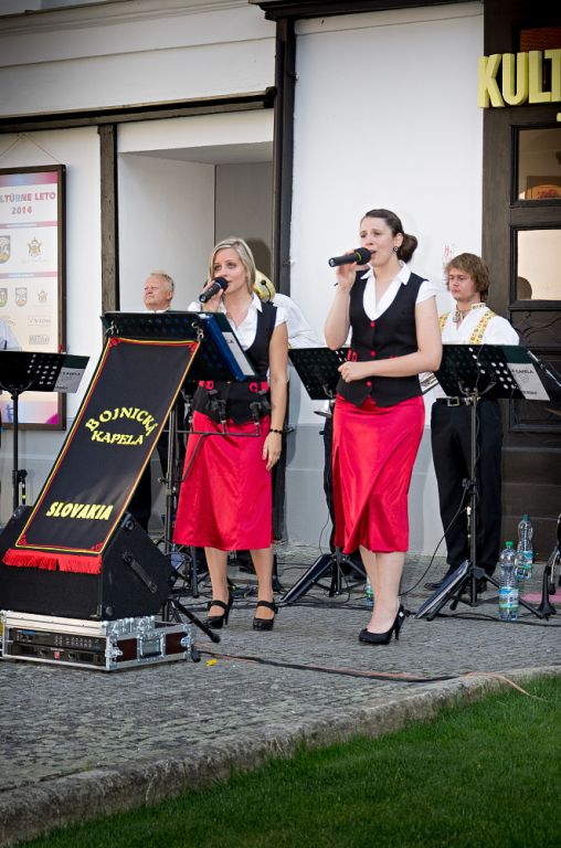 Hosťom sviatočného nedeľného popoludnia bola dychová hudba Bojnická kapela, ktorá si získala srdcia milovníkov tohto hudobného žánru z radov tých skôr narodených, ale aj mladých. Za tento úspech vďačia predovšetkým krásnym ľudovým slovenským piesňam, ale aj moravským, či českým, ale aj vďaka modernej, tanečnej a muzikálovej hudbe, ktoré sú neoddeliteľnou súčasťou ich repertoáru. V spoločnosti krásnych piesní v podaní týchto vynikajúcich hudobníkov aj spevákov strávili návštevníci Kultúrneho leta 2014 príjemné chvíle, za čo patrí Bojnickej kapele veľké poďakovanie a prajeme im do ďalších rokov veľa umeleckých aj osobných úspechov!
