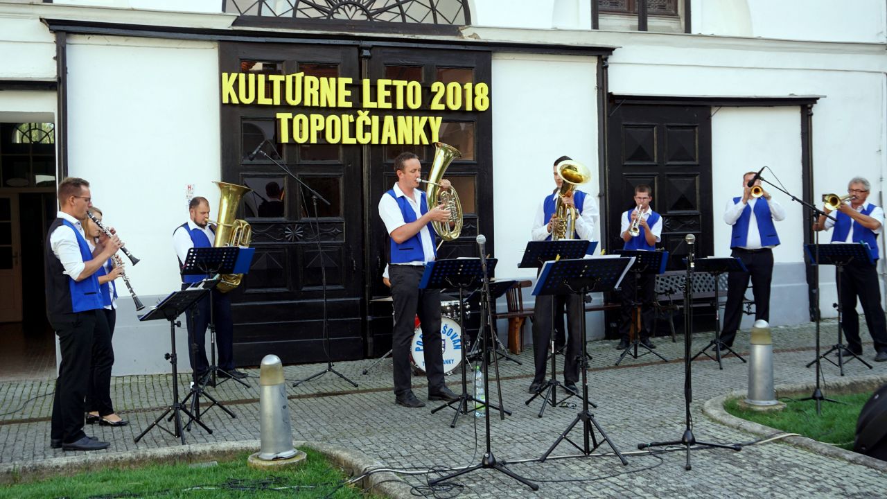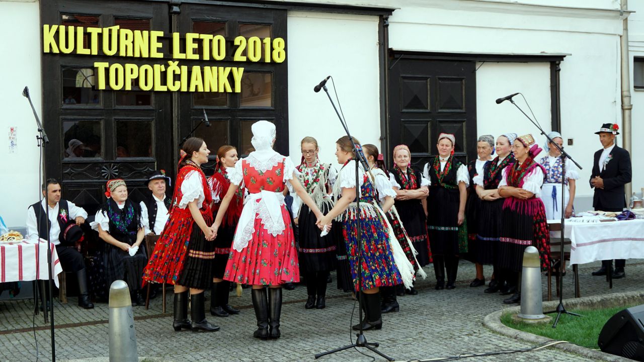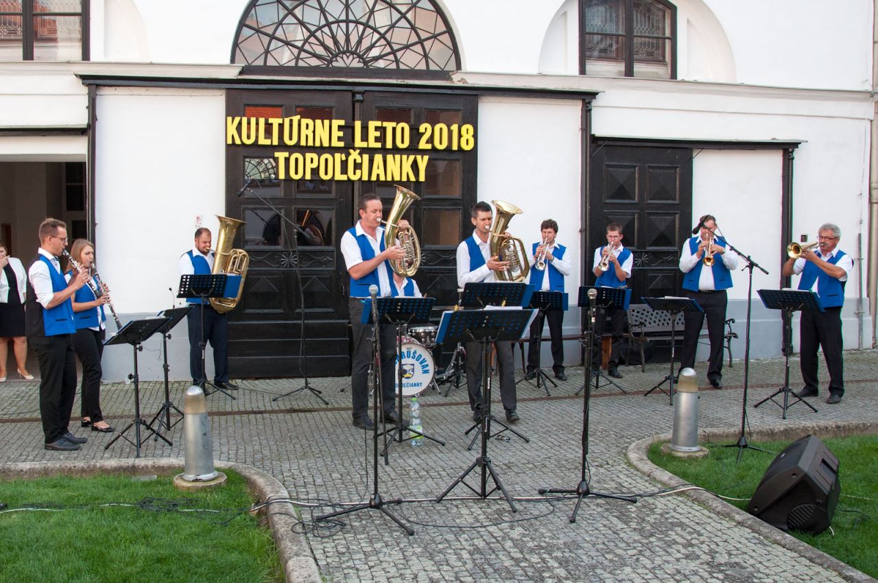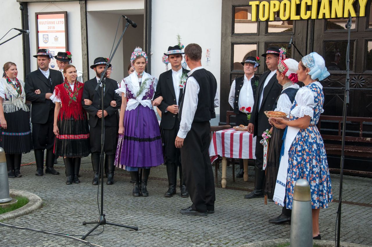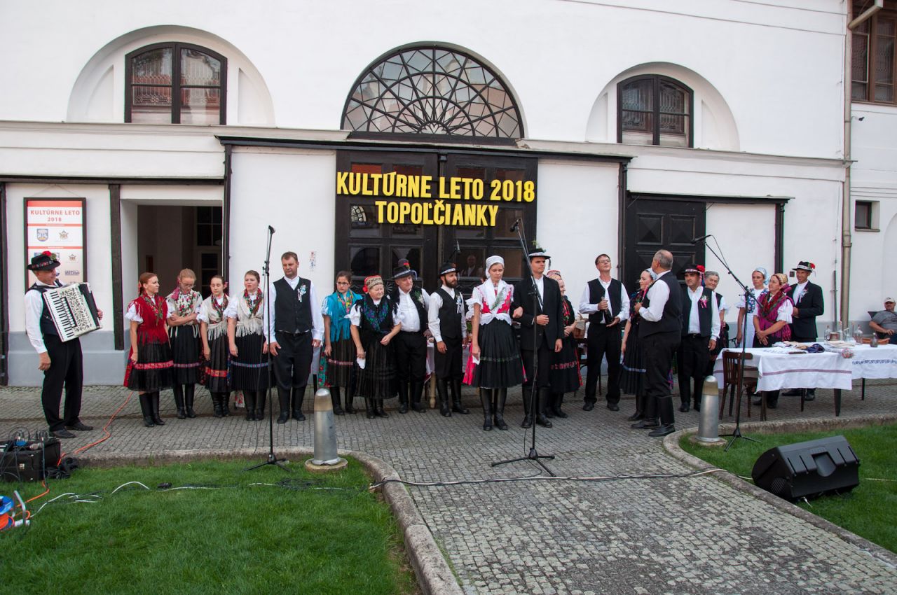 Folklórna skupina Topoľnica sa návštevníkom Kultúrneho leta predstavila folklórnym pásmom „Svadba v Topoľčiankach“ a priblížila tak aj mladším generáciám zvyky a tradície ako kedysi v Topoľčiankach prebiehali svadobné prípravy, svadba a čo všetko s ňou súviselo. Bližšie nás v úvode o pripravenom folklórnom pásme poinformovala vedúca skupiny, pani Danka Cigáňová. Druhým účinkujúcim hosťom bola DH Podhrušovan, ktorých veselé a temperamentné Slovenské, ale aj Moravské a České orchestrálne a ľudové piesne upravené známymi slovenskými a českými skladateľmi sa rozliehali celým historickým nádvorím zámku a potešili návštevníkov podujatia, ktorí si tie známejšie piesne mohli so sympatickou speváckou trojicou Dášou Kunkelovou, Lenku Pavlíkovou a Romankom Kováčom aj zaspievať. Záver nedeľného popoludnia KL ktoré nám spríjemnili a obohatili naše dva domáce súbory patril ich spoločnej piesni „Slovenské mamičky“, ktorou sa s publokom rozlúčili.