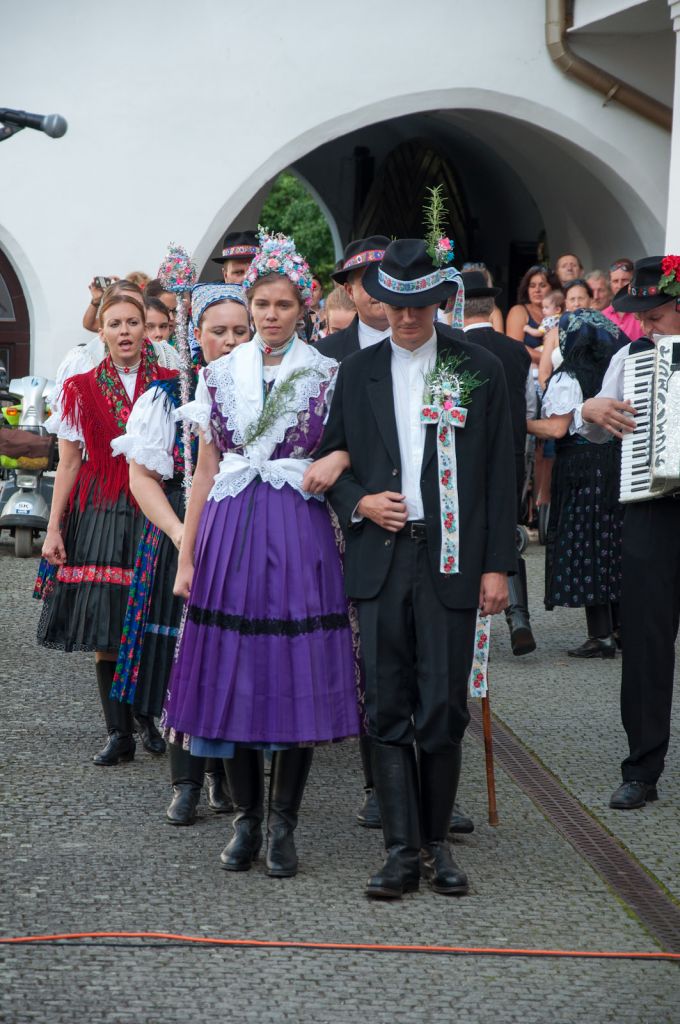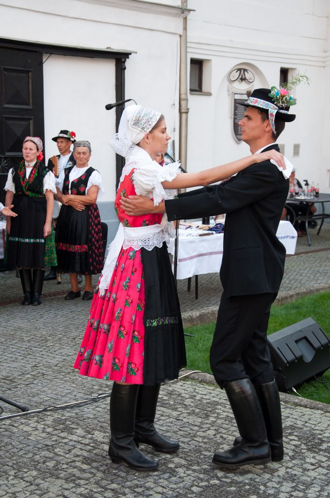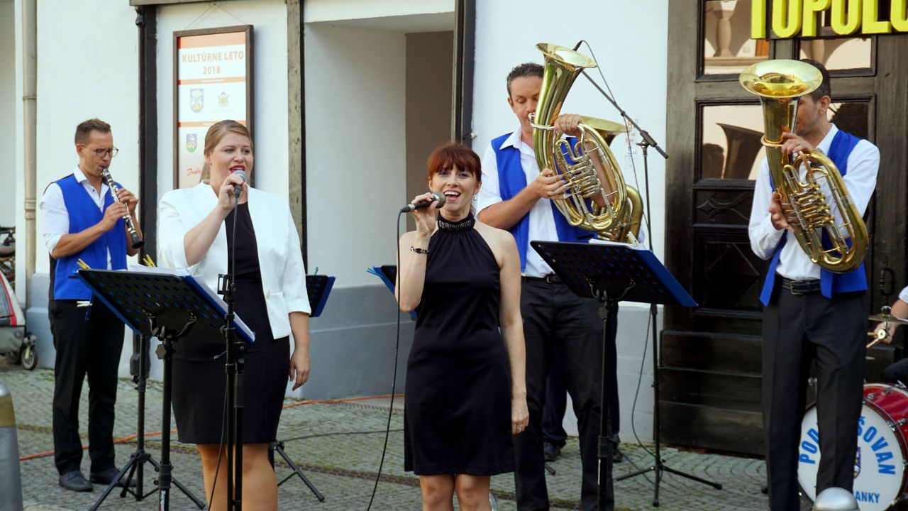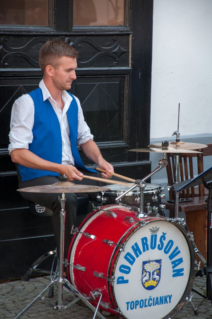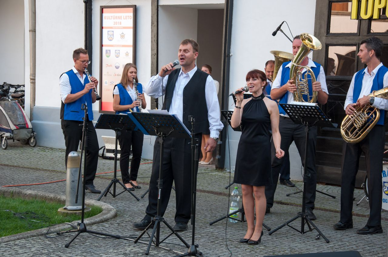 Folklórna skupina Topoľnica sa návštevníkom Kultúrneho leta predstavila folklórnym pásmom „Svadba v Topoľčiankach“ a priblížila tak aj mladším generáciám zvyky a tradície ako kedysi v Topoľčiankach prebiehali svadobné prípravy, svadba a čo všetko s ňou súviselo. Bližšie nás v úvode o pripravenom folklórnom pásme poinformovala vedúca skupiny, pani Danka Cigáňová. Druhým účinkujúcim hosťom bola DH Podhrušovan, ktorých veselé a temperamentné Slovenské, ale aj Moravské a České orchestrálne a ľudové piesne upravené známymi slovenskými a českými skladateľmi sa rozliehali celým historickým nádvorím zámku a potešili návštevníkov podujatia, ktorí si tie známejšie piesne mohli so sympatickou speváckou trojicou Dášou Kunkelovou, Lenku Pavlíkovou a Romankom Kováčom aj zaspievať. Záver nedeľného popoludnia KL ktoré nám spríjemnili a obohatili naše dva domáce súbory patril ich spoločnej piesni „Slovenské mamičky“, ktorou sa s publokom rozlúčili.