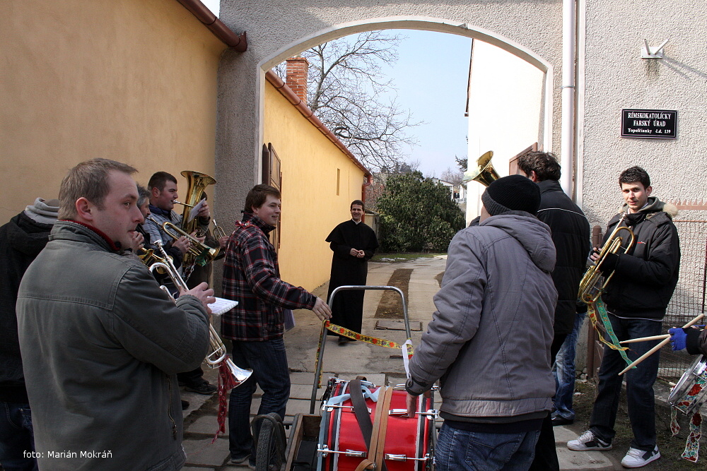 Je v podstate obdobím prechodu od zimy k jari. V obmedzenej podobe sa s oslavami fašiangov stretávame ešte takmer vo všetkých regiónoch Slovenska i dnes. V snahe zachovávania tejto milej tradície si ich v našej obci každoročne pripomíname fašiangovým sprievodom, ktorého účastníkmi sú členovia folklórnej skupiny Topoľnica a dychovej hudby Podhrušovan vyobliekaní v krásnych topoľčianskych krojoch. V sobotu 5. marca 2011 takto spievajúc a hrajúc poprechádzali všetkými ulicami Topoľčianok, čo je spolu úctyhodných 13 km. Súčasťou tohto sprievodu je vyzdobený voz ťahaný párom koní. Fašiangy, Turíce, Veľká noc príde … sa ozývalo ulicami Topoľčianok a veríme, že táto tradícia v obci zostane naďalej zachovaná, pretože Topoľnica aj Podhrušovan si medzi seba získavajú a vychovávajú nových mladých členov.
