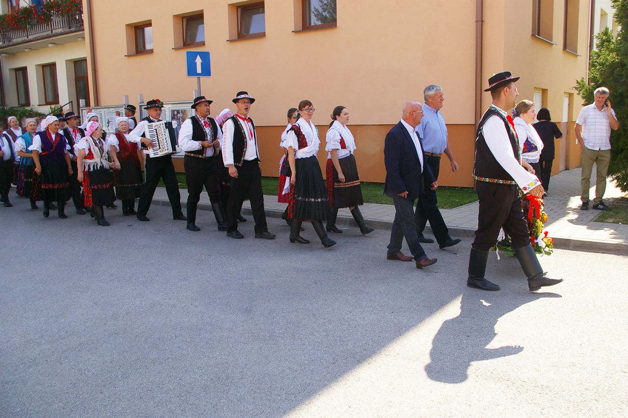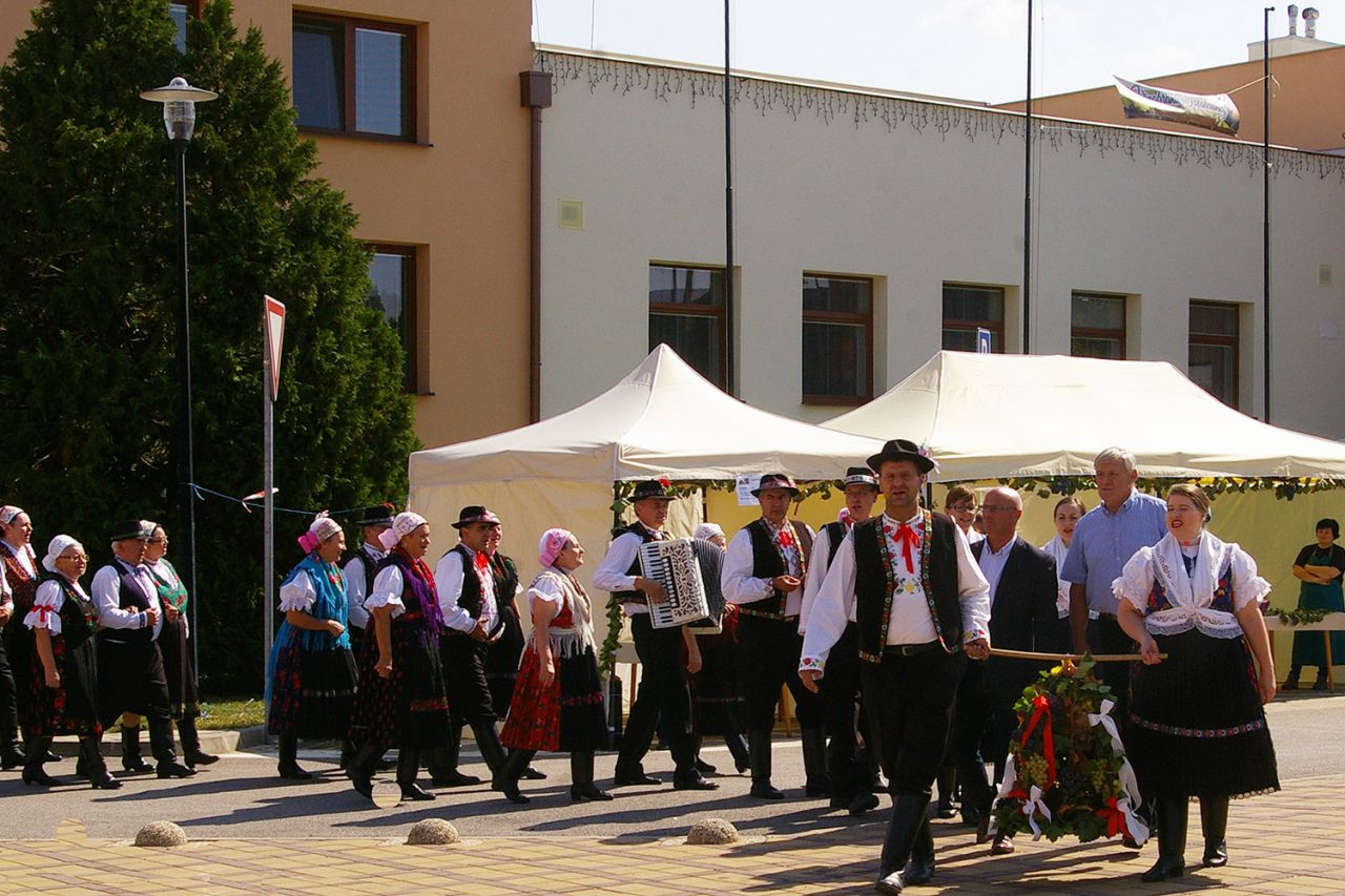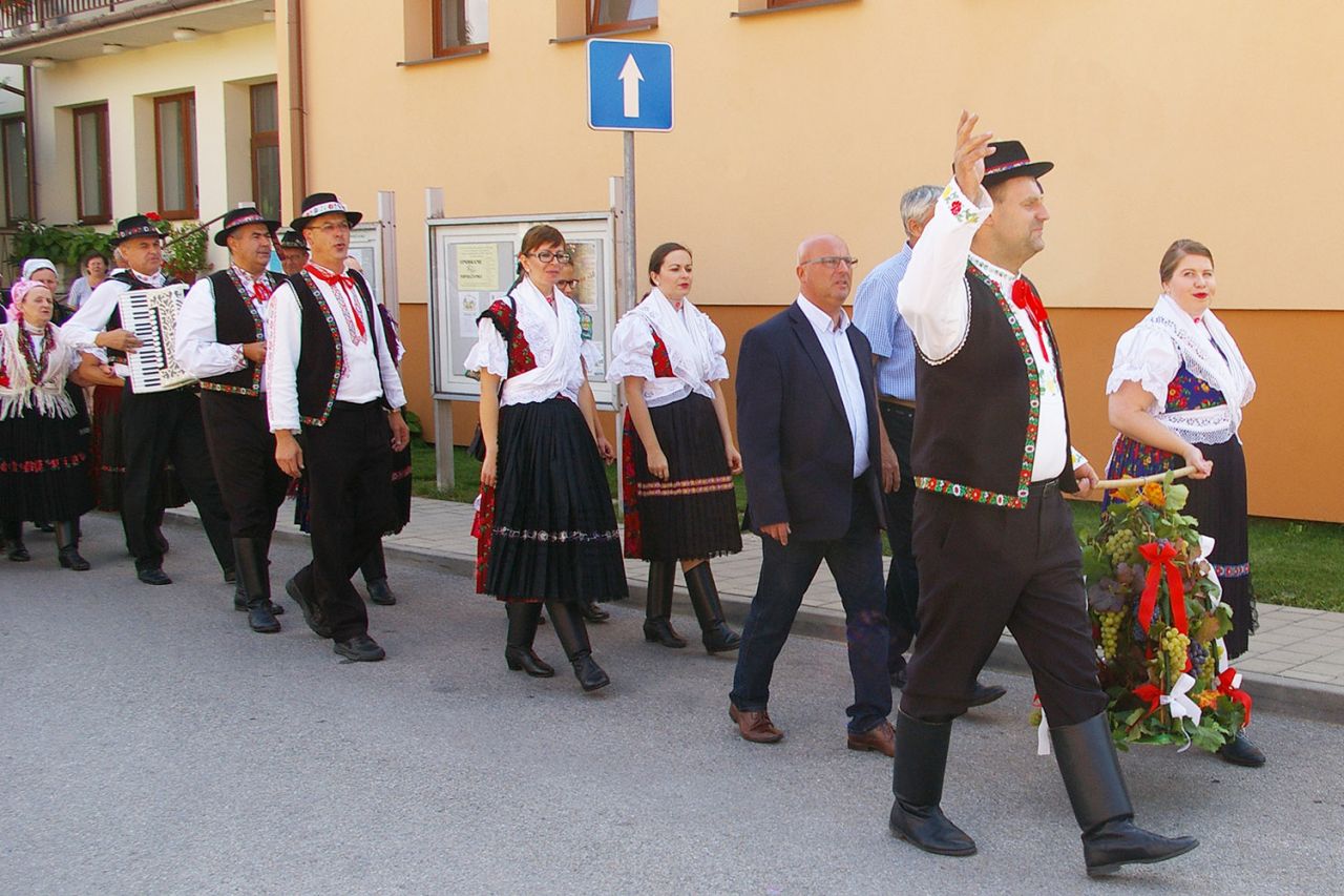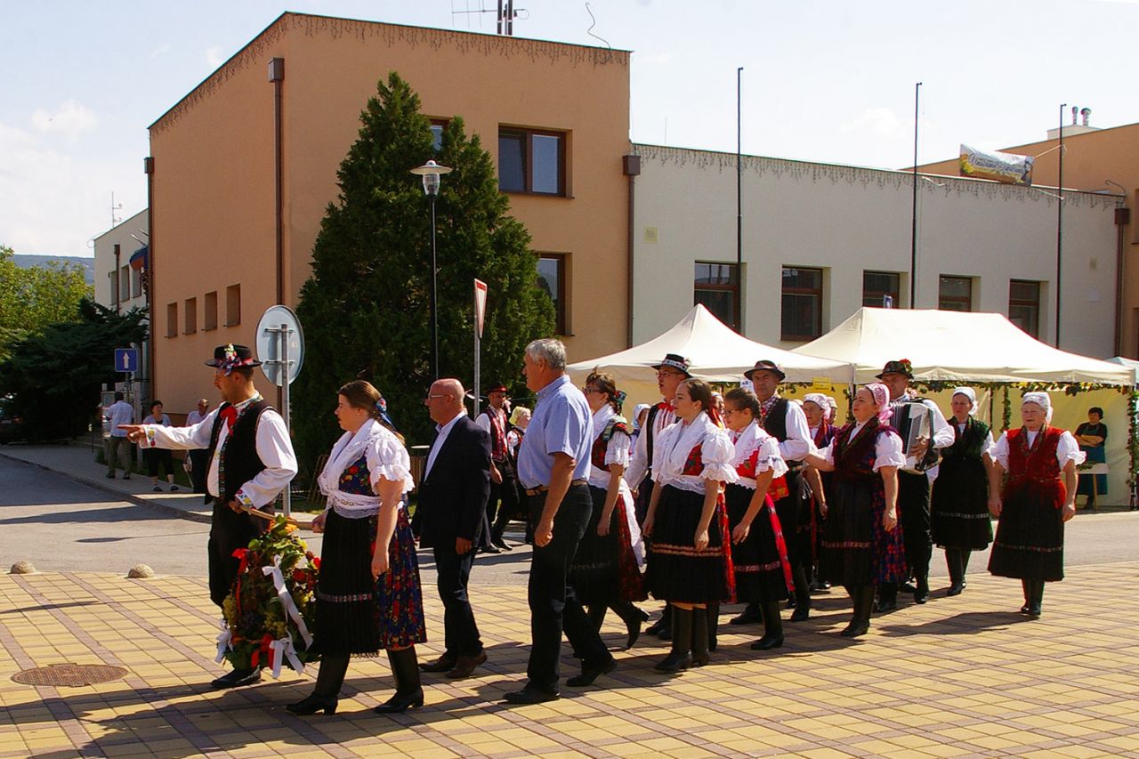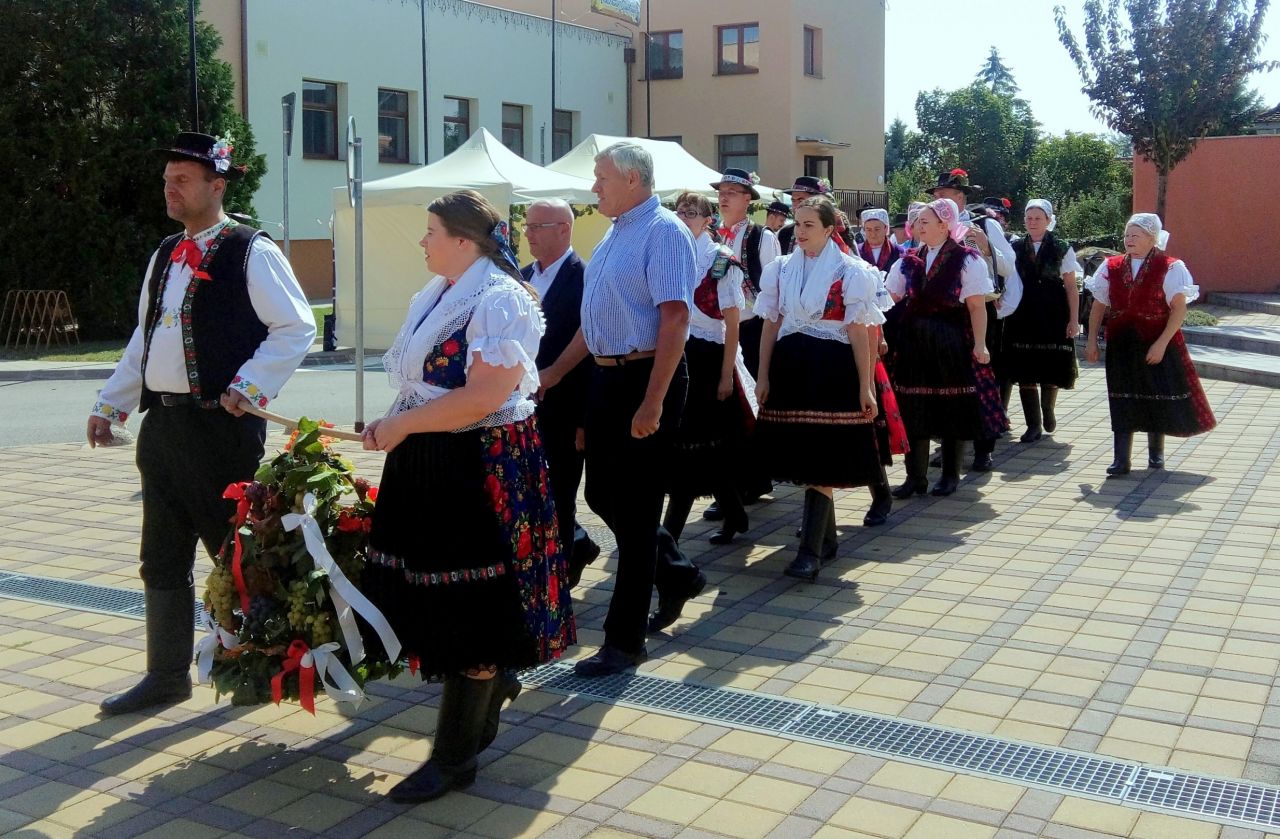 Skôr ako úvodnými príhovormi predseda ZO SZZ v Topoľčiankach p. Miroslav Toman a starosta Obce Topoľčianky p. Juraj Mesko pozdravili všetkých prítomných a otvorili slávnosť „Vinobrania“, priniesol sprievod krojovaných folklórnych súborov , ktorý tvorili členovia Folklórnej skupiny Topoľnica z Topoľčianok a Folklórnej skupiny Cerianka z Loviec krásny dožinkový vinohradnícky veniec. Príjemné sobotné popoludnie s bohatým kultúrnym programom sa nezaobišlo bez stánkov s občerstvením a tak si návštevníci podujatia mohli pochutnať na guláši z diviny, pečených klobáskach, jaterniciach, chutnom burčiaku a vínku.