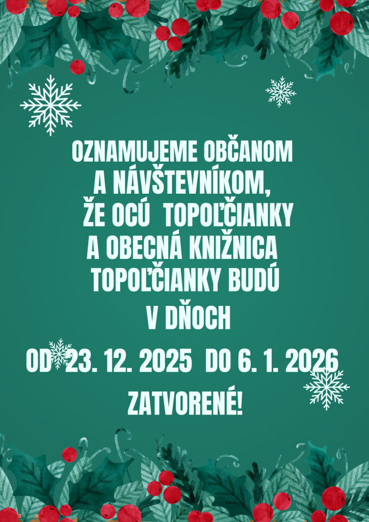OcÚ Topoľčianky a Obecná knižnica Topoľčianky budú v dňoch od 23.12.2025 do 6.1.2026 zatvorené!